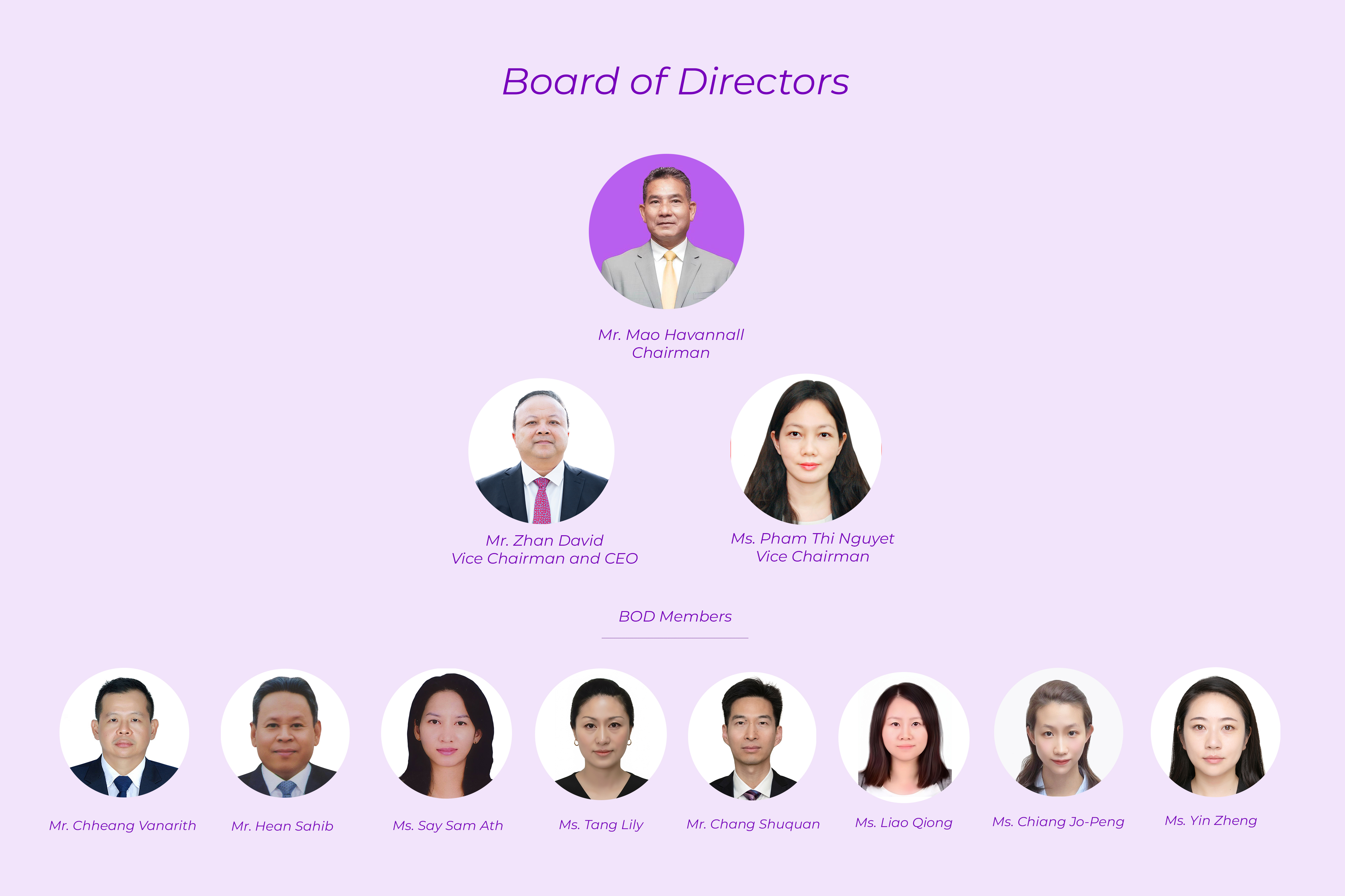現在の取締役会会長は、カンボジア民間航空庁(SSCA)を管轄する大臣である H.E. Mao Havannall 氏が務めており、副会長兼CEOには Dr. Zhan David 氏が就任しています。